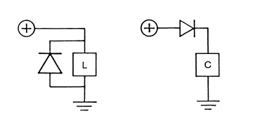 左圖為L(zhǎng)-電路和C-電路續(xù)流二極管的接法, 對(duì)于存在L-電路和C-電路的地方必須接續(xù)流二極管,以防止脈沖電壓的產(chǎn)生,從而引起電路其它元件的損傷.