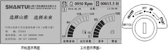 啟動開關(guān)分為三個檔位,分別為OFF檔,ON檔和START檔。當(dāng)啟動開關(guān)處于OFF檔時,系統(tǒng)處于斷電狀態(tài);當(dāng)插入鑰匙,把啟動開關(guān)從OFF檔打到ON檔時,監(jiān)控系統(tǒng)得電,監(jiān)控儀表顯示短暫的開機(jī)界面后,進(jìn)入工作顯示界面,如圖所示。此時把啟動開關(guān)從ON檔打到START檔,待發(fā)動機(jī)啟動后松開鑰匙,啟動開關(guān)將自動退回ON檔。