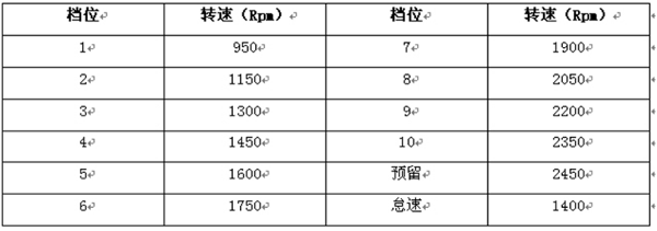 顯示當(dāng)前油門檔位是1檔。隨著油門檔位增加,轉(zhuǎn)速作對應(yīng)的增加,詳見如下表格。