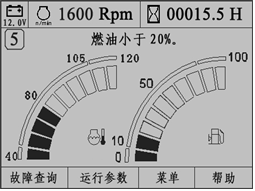 2)燃油油位;3)機(jī)油壓力;4)液壓油溫;5)轉(zhuǎn)速;6)空氣濾清堵塞;7)預(yù)熱指示;8)充電及系統(tǒng)電壓指示;9)各種工作狀態(tài)等。