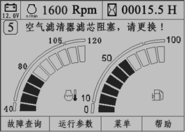 啟動發(fā)動機(jī)后,如果空氣濾清器堵塞,監(jiān)控儀表提示“空氣濾清器濾芯阻塞,請更換!”文字報(bào)警,監(jiān)控儀表面板上空濾報(bào)警指示燈