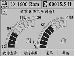 啟動發(fā)動機(jī)后,如果系統(tǒng)電壓值大于14.5V,監(jiān)控儀表提示“當(dāng)前系統(tǒng)電壓過高!”文字報(bào)警,同時蜂鳴器鳴叫。如果系統(tǒng)電壓值小于11.0V,監(jiān)控儀表提示“當(dāng)前系統(tǒng)電壓過低!”文字報(bào)警,同時蜂鳴器鳴叫,如圖所示。