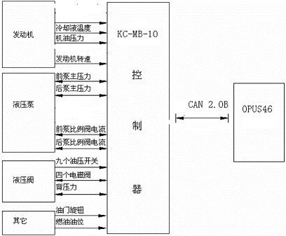 本系統(tǒng)由KC-MB-10控制器、OPUS46顯示、油門控制單元以及一些必要的模擬量、開關(guān)量傳感器、模式電磁閥組、開關(guān)閥等組成。通過對發(fā)動機(jī)和液壓泵系統(tǒng)進(jìn)行綜合控制,使二者達(dá)到最佳匹配,以達(dá)到明顯的節(jié)能效果。