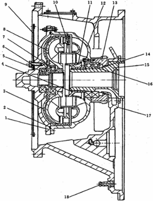 發(fā)動(dòng)機(jī)的動(dòng)力按如下路線輸入至泵輪:發(fā)動(dòng)機(jī)飛輪 → 彈性板9 → 罩輪1 → 泵輪12。柴油機(jī)飛輪和彈性板9的外緣用雙頭螺柱連接,彈性板的內(nèi)緣則用螺栓6與罩輪1相連。罩輪與泵輪12之間為了密封,應(yīng)用了一個(gè)“O”型密封圈2,并用較多的螺栓連接,罩輪和泵輪聯(lián)接處用配合面定位,以保證泵輪與發(fā)動(dòng)機(jī)曲軸的同心度。