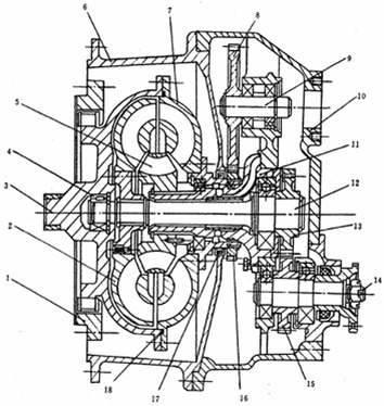 泵輪通過兩排球軸承16支承在導(dǎo)輪座上。裝配時(shí),先將分動(dòng)齒輪支承在導(dǎo)輪座的兩排軸承上,再用螺栓將泵輪與分動(dòng)齒輪13相連。