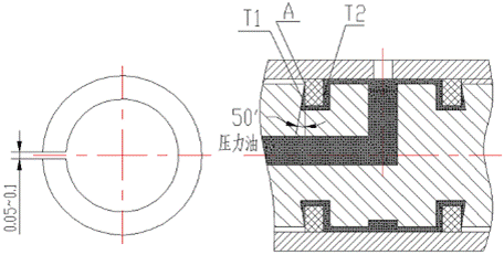 密封環(huán)12和14的安裝好壞和使用中的摩擦將影響操縱油的密封情況,從而影響離合器的工作,應(yīng)此對(duì)密封環(huán)的安裝要予以足夠的重視。見密封示意圖。在軸上的槽中,靠外側(cè)一面有50‘的斜角,會(huì)使兩側(cè)的T1及T2面產(chǎn)生壓力差,T2面壓力稍大于T1面,在壓力差的作用下,緊壓在A點(diǎn)附近的一個(gè)小環(huán)形面上,達(dá)到密封的目的,并在A點(diǎn)附近產(chǎn)生相對(duì)轉(zhuǎn)動(dòng)與摩擦。密封環(huán)的外圓因受密封環(huán)的張緊力,而壓在套的內(nèi)圓面上。