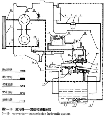 液力傳動(dòng)油經(jīng)變速泵輸出,經(jīng)濾油器過濾后供給變速操縱閥(或減壓閥)。工作油液首先進(jìn)入變速操縱閥的變速操縱油路,滿足變速要求,然后一部分油液再進(jìn)入變矩器。