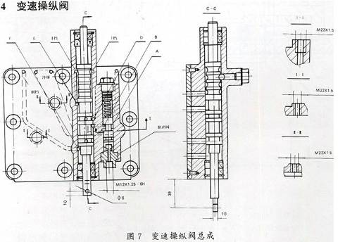 包括制動(dòng)安全閥和變速閥。見圖。閥體上的A孔通變速器組合閥。當(dāng)移動(dòng)變速滑閥時(shí),來自變矩組合閥的壓力油便可以分別流入孔D、E或F,(D通Ⅰ檔、E通Ⅱ檔、 F通倒檔)。閥體頂面上F點(diǎn)位置處Z1/8”螺孔為倒檔油壓輸出接口。