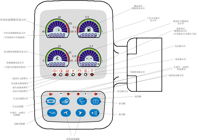 18、按鍵功能切換檢測(cè):按動(dòng)FUN按鍵,儀表將在工作小時(shí)數(shù)和機(jī)油壓力精確值之間切換顯示,當(dāng)處于機(jī)油壓力精確值顯示時(shí),按動(dòng)左鍵或右鍵也能實(shí)現(xiàn)工作小時(shí)數(shù)和機(jī)油壓力精確值之間的切換功能,說明儀表功能按鍵正常。