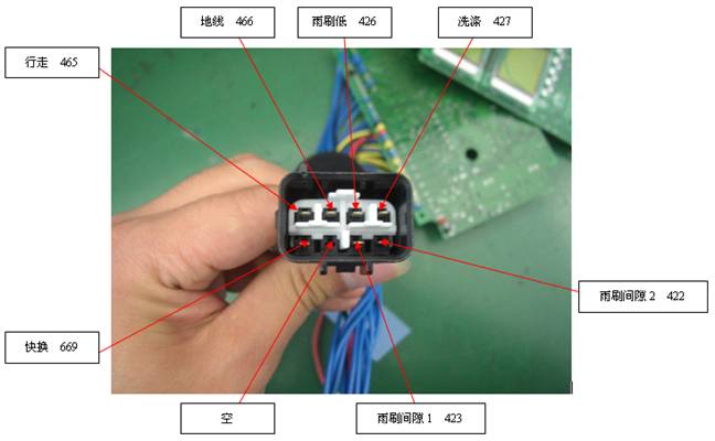 16、按鍵雨刮輸出檢測(cè):在儀表上電的情況下,按動(dòng)雨刮按鍵一次,儀表如圖2護(hù)套(423號(hào)線)接頭輸出對(duì)地12V電壓,燈光相應(yīng)指示燈點(diǎn)亮;按動(dòng)燈光按鍵二次,儀表如圖護(hù)套(422號(hào)線)接頭輸出對(duì)地12V電壓,燈光相應(yīng)指示燈點(diǎn)亮;按動(dòng)燈光按鍵三次,儀表426號(hào)線接頭輸出對(duì)地12V電壓,燈光兩指示燈同時(shí)點(diǎn)亮,說明儀表行走輸出正常。