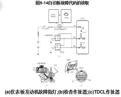 如圖5-14  (a)所示;電控單元檢測(cè)插座一般位于發(fā)動(dòng)機(jī)艙內(nèi)。當(dāng)將檢測(cè)插座與檢測(cè)端子TE對(duì)地短接后(如圖5-14  ( b)所示),發(fā)動(dòng)機(jī)警告燈會(huì)閃爍,閃爍次數(shù)即故障代碼;故障診斷插座通常位于儀表板下方,它是電控系統(tǒng)診斷信號(hào)的專用連接器,主要用于與專用車外故障診斷儀(也稱電腦解碼器)相連接,進(jìn)行車外診斷,以擴(kuò)充隨車診斷系統(tǒng)的診斷信息和診斷功能。