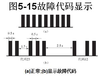①用儀表板上“檢查發(fā)動(dòng)機(jī)”警告燈的閃爍規(guī)律讀取。若電控系統(tǒng)工作正常,電控單元內(nèi)未存有故障代碼,則警告燈以每秒5次的頻率連續(xù)閃爍,如圖5-15(a)所示。若電控單元內(nèi)存有故障代碼,則警告燈以每秒2次的閃爍頻率連續(xù)閃爍,并將兩位數(shù)組成的故障代碼的十位數(shù)和個(gè)位數(shù),先后用警告燈的閃爍次數(shù)表示出來(lái),如圖5-15(b)所示。若電控單元內(nèi)存有若干個(gè)故障代碼時(shí),電控單元按故障代碼的大小,依次將所有儲(chǔ)存故障代碼顯示出來(lái)。兩個(gè)故障代碼之間的間歇時(shí)間為2.s。當(dāng)所有故障代碼全部顯示完后,燈閃停頓4.s,然后再重新開(kāi)始顯示。如此反復(fù),直至從檢測(cè)插座上拔下連接導(dǎo)線為止。