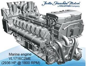新型 Isotta 推進發(fā)動機 V 1712 C2 MLH 船用柴油發(fā)動機,四沖程循環(huán)柴油發(fā)動機,博世高壓共軌燃油噴射系統(tǒng),帶廢氣渦輪增壓器和管式原水/增壓空氣中冷的增壓系統(tǒng),發(fā)動機冷卻系統(tǒng)設(shè)計用于淡水/海水龍骨冷卻型熱交換器,帶有集成集水箱和恒溫控制,絕熱排氣歧管。