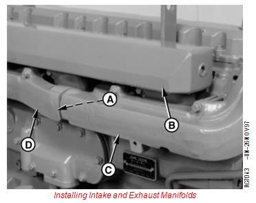 1. Install intake manifold (B) using new gaskets. Tighten cap screws to specifications.