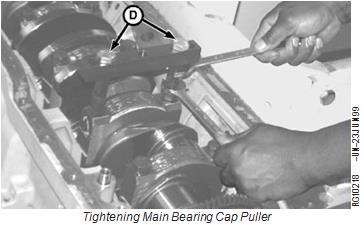 IMPORTANT: Before removing main bearing caps (A), check for proper torque on all main bearings. Also, check each bearing cap to make sure they are numbered for reassembly on the same numbered main bearing bosses. Keep matched main bearings with their respective main bearing cap for comparison with crankshaft journal (surface wear) from which removed.