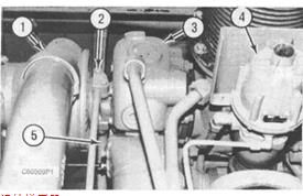 (1)渦輪增壓器進(jìn)氣口(2)燃料吸入管路(3)水冷式渦輪機(jī)殼體(4)排氣旁通閥(5)放油管