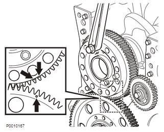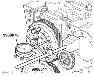 7 使用9999696 磁力架和 9989876 千分表檢查曲軸軸向游隙。使用 9998511 桿來回移動(dòng)曲軸。讀取千分表上的值并對(duì)比技術(shù)數(shù)據(jù)。
