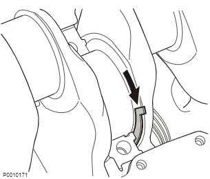 4 當(dāng)沃爾沃曲軸已降到主軸承上時(shí),檢查并確認(rèn)它們已正確定位。安裝止推墊圈,使定位調(diào)整片最終處于指定的槽口中。