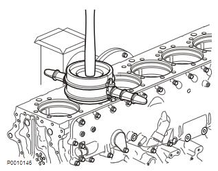 2 用活塞環(huán)夾子和連桿將活塞提升就位(大端軸承已潤滑)。確保活塞朝向正確的方向(這樣,連桿便處于曲軸上的正確位置)。用錘柄向下敲擊活塞。當(dāng)活塞處于活塞環(huán)夾子下方時,拆下活塞環(huán)夾子。重新安裝缸套用壓緊工具。向下按壓活塞,使連桿接觸曲軸。安裝大端軸承蓋,將其與曲軸恰好對準(zhǔn)(大端軸承已潤滑)。安裝螺栓。扭矩緊固螺栓,檢查并確認(rèn)曲軸可以轉(zhuǎn)動。