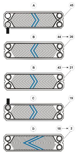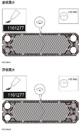 volvo沃爾沃冷卻板和安裝順序45 個板可供選擇P0016342A1 個底板(45)。圖案指向右邊。記錄已密封孔的位置。注意 唯一獨(dú)特密封件。B13 個精細(xì)圖案冷卻板。必須轉(zhuǎn)到每另一個板上的圖案指向左邊。(44、42、40......20)。B12 個精細(xì)圖案冷卻板。必須轉(zhuǎn)到每另一個板上的圖案指向右邊。(43,41,39 ...21)C1 個中間板(#19)。圖案指向右邊。記錄已密封孔的位置。D9 個粗糙圖案冷卻板。