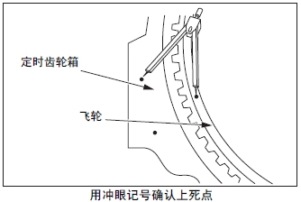 (3) No.1 氣缸的上死點(diǎn)可用這樣的方法確認(rèn),即當(dāng)飛輪端面和定時(shí)齒輪箱上打刻的3個(gè)沖眼記號(hào)其距離相等時(shí)為No.1 氣缸的上死點(diǎn)。